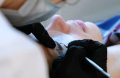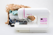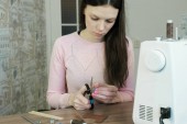 Młoda kobieta szyje Błękitna Kurtka na biały szycia druków.