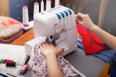 Zdjęcie "Młoda kobieta szyje Błękitna Kurtka na biały szycia druków." może być wykorzystywane do celów osobistych i komercyjnych zgodnie z warunkami zakupionej licencji Royalty-free. Obraz jest dostępny do pobrania w jakości wysokiej rozdzielczości do 5760x3840.