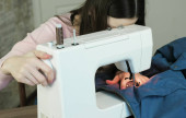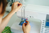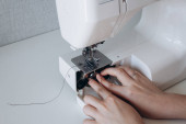 Zdjęcie "Kobieta lekkich tkaniny szycia na zbliżenie maszyna do szycia. Widok z boku." może być wykorzystywane do celów osobistych i komercyjnych zgodnie z warunkami zakupionej licencji Royalty-free. Obraz jest dostępny do pobrania w jakości wysokiej rozdzielczości do 5760x3840.