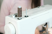 Kobieta lekkich tkaniny szycia na zbliżenie maszyna do szycia. Widok z boku.