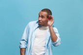 Młody, atrakcyjny mężczyzna patrząc zdziwiony na białym tle na niebiesko