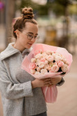 uśmiechnięta kobieta z bukietem kwiatów, czytanie, że kocham Cię Mama pocztówka, koncepcja dzień matki
