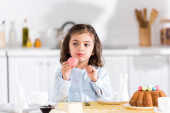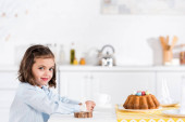 portret słodkie dziecko z szklankę mleka i domowe naleśniki z miodem i owoce na stole