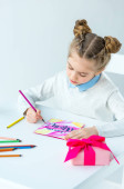 wesoły matka i córka podejmowania pocztówka pozdrowienie razem przy stole