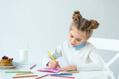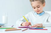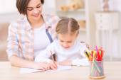 uśmiechający się matka, patrząc na córkę podejmowania pocztówka pozdrowienie w tabeli