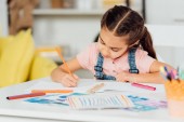 portret dziecka rysunek pozdrowienie pocztówka dla matki z kolorowe ołówki przy stole, matki dzień wakacje koncepcji