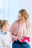 portret Uśmiechnięte matki tulenie Ładna Córka z pocztówka pozdrowienie w ręce, koncepcja wakacje dzień matki