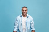 Poważny biznesmen, stojąc i patrząc na kamery tle studio.