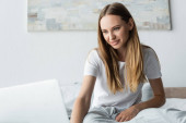 piękna kobieta, leżąc w łóżku w rano i patrząc na kamery