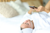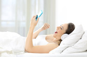 Zdjęcie "Szczęśliwa kobieta smat-słuchanie muzyki w łóżku" może być wykorzystywane do celów osobistych i komercyjnych zgodnie z warunkami zakupionej licencji Royalty-free. Obraz jest dostępny do pobrania w jakości wysokiej rozdzielczości do 5760x3840.