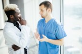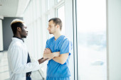 Mieszane rasy lekarzy. Dwóch mężczyzn lekarze recenzowania RTG w korytarzu szpitala
