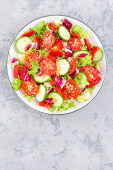 Sałatką ze świeżych warzyw z pomidory, ogórki, papryka i sezamu. Sałatka warzywna na białym talerzu