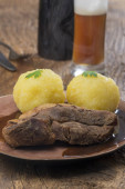 niemiecki sauerbraten z czerwoną kapustą na talerzu