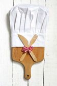 Kucharski kapelusik z łyżki i ostrze na pomarańczowym tle