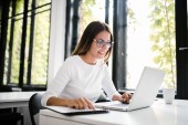 Młoda kobieta interesu pisania na laptopa w biurze jasne