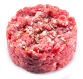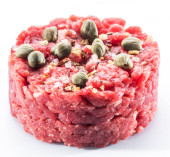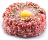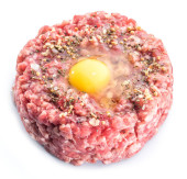 Kotlet z ziemi lub surowego hamburger z żółtka jaj przepiórczych i przyprawy