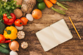 Zdjęcie "Świeże warzywa na drewnianym stole. Widok z góry miejsce" może być wykorzystywane do celów osobistych i komercyjnych zgodnie z warunkami zakupionej licencji Royalty-free. Obraz jest dostępny do pobrania w jakości wysokiej rozdzielczości do 5760x3840.