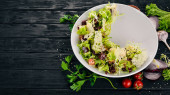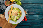 Sałatka Cezar z krewetek. Na czarnym tle drewnianych. Widok z góry. Miejsce dla tekstu.