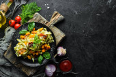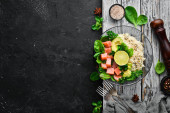 Zdjęcie "Sałatka z kurczakiem i warzywami. Cezar. Widok z góry. Na czarnym tle drewnianych. Miejsce." może być wykorzystywane do celów osobistych i komercyjnych zgodnie z warunkami zakupionej licencji Royalty-free. Obraz jest dostępny do pobrania w jakości wysokiej rozdzielczości do 5760x3840.