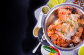 Tradycyjne hiszpańskie owoce morza paella pan ryż, groszek, krewetki, małże, kałamarnice na światło szare tło betonu. Widok z góry, lato. Kwadratowych upraw