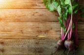 Bukiet świeżych organicznych buraki na podłoże drewniane. Pojęcie diety, raw, wegetariański posiłek. Stylu gospodarstwa, rustic i kraju