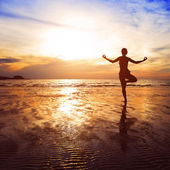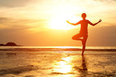 młoda kobieta praktykowania jogi na plaży w zatoce siam podczas zachodu słońca