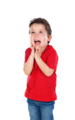 ładny chłopak szczęśliwy w czerwony t-shirt pozowanie na białym tle