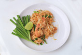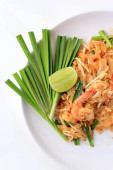 Pad Thai, smażone ryż makaron z krewetkami w białe płytki z slajdów cytryna i zielonych warzyw. Jeden z Tajlandii główne danie narodowe. Popularne żywności w Tajlandii. Makaron smażony tajski