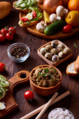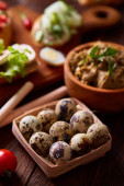 Śniadanie Martwa natura z Kanapki, Jaja przepiórcze, przyprawy i i świeżych owoców i warzyw, Selektywny fokus