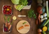 Asortyment świeżych owoców i warzyw z deską do krojenia na podłoże drewniane
