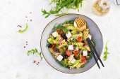 Zdjęcie "Sałatka z świeżych pomidorów, ogórków i ser feta w greckim stylu. Leżał z płaskim. Widok z góry z miejsca kopii" może być wykorzystywane do celów osobistych i komercyjnych zgodnie z warunkami zakupionej licencji Royalty-free. Obraz jest dostępny do pobrania w jakości wysokiej rozdzielczości do 5760x3840.