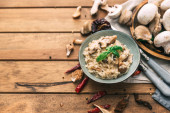Mięso z grilla z ryżem na len tabeli. Hiszpańskie tapas