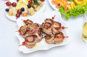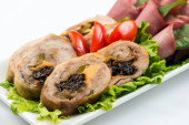 Rolle mięsne z szynką, serem i zieleni na białym tle