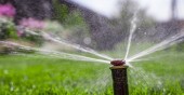 automatyczny system zraszania podlewania trawnika na tle zielonej trawy