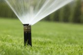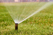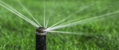 automatyczny system zraszania podlewania trawnika na tle zielonej trawy