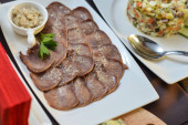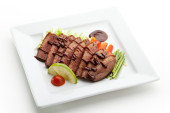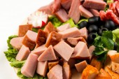 Rolle mięsne z szynką, serem i zieleni na białym tle