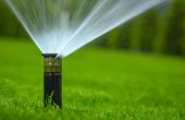 automatyczny system zraszania podlewania trawnika na tle zielonej trawy