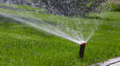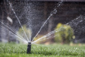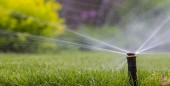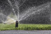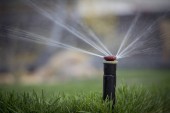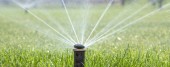 automatyczny system zraszania podlewania trawnika na tle zielonej trawy