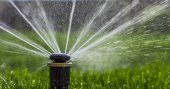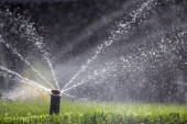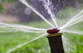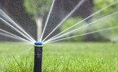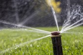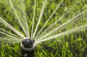 automatyczny system zraszania podlewania trawnika na tle zielonej trawy