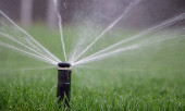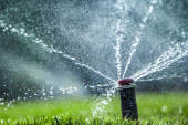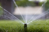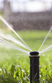 automatyczny system zraszania podlewania trawnika na tle zielonej trawy