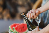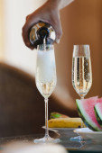 Dwie wysokie szklanki z winem musującym. Zamknij arbuza i banan