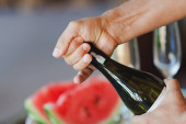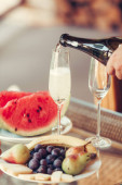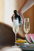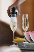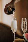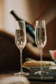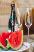 Dwie wysokie szklanki z winem musującym. Zamknij arbuza i banan