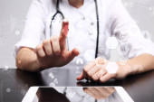 Lekarz medyczny rekord diagramu na koncepcja wirtualnego ekranu za pomocą nowoczesnego komputera. Zdrowia monitorowania aplikacji.