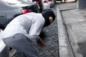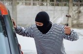 Zamaskowany złodziej, chowając się za Polaka przed włamaniem. Koncepcja karnych złodziej samochodów.
