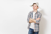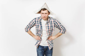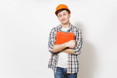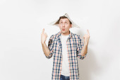 Zdjęcie "Młody człowiek uśmiechający się w ubranie i kapelusz gazecie wskazując palcami indeks na aparat na białym tle. Akcesoria do remontu mieszkanie Pokój. Koncepcja domu naprawy. Powierzchnia reklamowa." może być wykorzystywane do celów osobistych i komercyjnych zgodnie z warunkami zakupionej licencji Royalty-free. Obraz jest dostępny do pobrania w jakości wysokiej rozdzielczości do 5760x3840.
