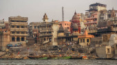 Quay z Ghaty i łodzi i pogrzeb pożary w Varanasi. Rzeka Ganges