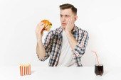 Głodny młoda kobieta łapczywie je burger, siada przy stole z frytkami, cola w butelce na białym tle. Prawidłowe odżywianie lub klasyczny amerykański fast food. Reklama obszar z miejsca kopii.