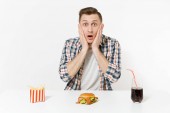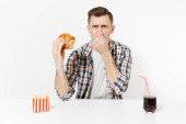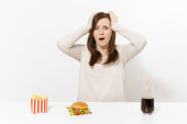 Młoda kobieta zabawa z ogonami, miara zwijana w talii przytrzymując burger, cola w szklanej butelce na białym tle na białym tle. Prawidłowe odżywianie lub klasyczny amerykański fast food. Reklama obszar z miejsca kopii.