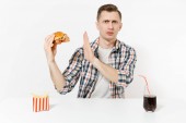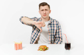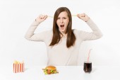 Piękna młoda kobieta siedzi przy stole z burger, frytki, cola w szklanej butelce na białym tle na białym tle. Prawidłowe odżywianie lub klasyczny amerykański fast food. Reklama obszar z miejsca kopii.
