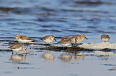 Małe stadko dunlins (Calidris alpina), poszukując pokarmu na niebieski woda